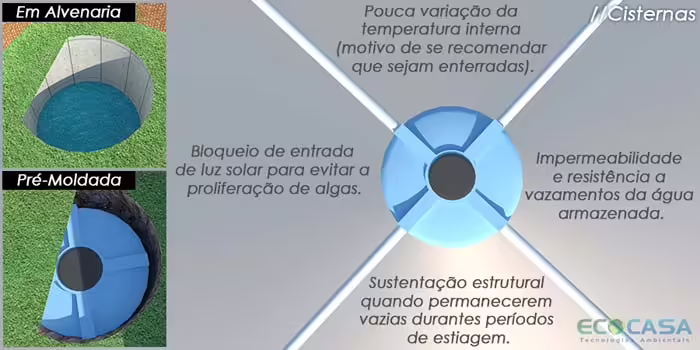 As cisternas são reservatórios de água que normalmente ficam enterrados para evitar exposição à luz e proliferação de algas, além de manter a água a uma temperatura mais baixa. A origem da água pode ser da chuva (sistema de aproveitamento de água da chuva) ou de outras fontes como carros pipa, por exemplo.